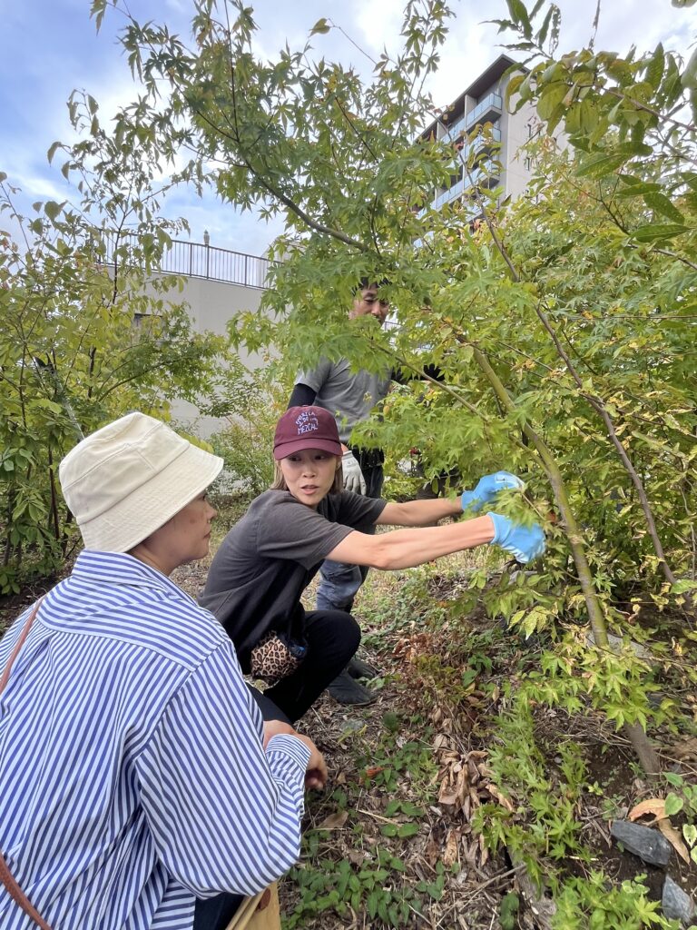 さっそく剪定実習。品川区商店街連合会の榎田陽子さん、そして公共R不動産のプロジェクトに関わる梶田裕美子さんも剪定バサミ持参で参加してくださいました。