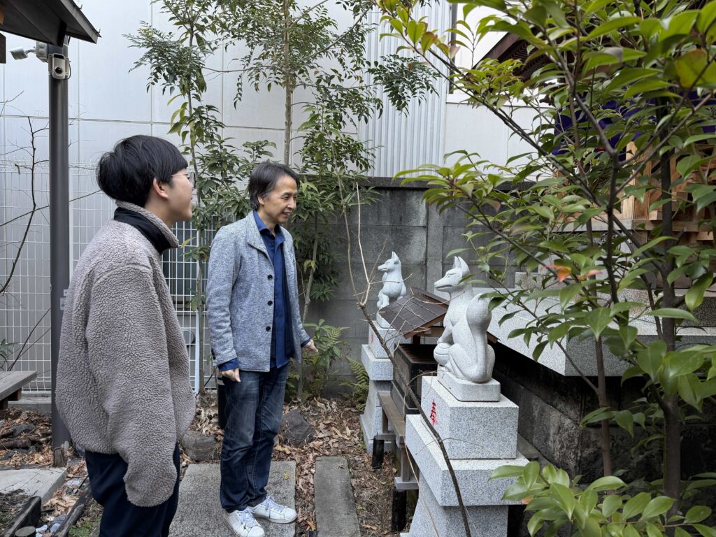 代表・井上とかなめのもりの稲荷神社に参拝する江澤さん(左)。お社を支える石組みの下の環境を守るため、ビル建て替え中もこの石組みと周辺に囲いがされていた話に熱心に聞き入っていました。